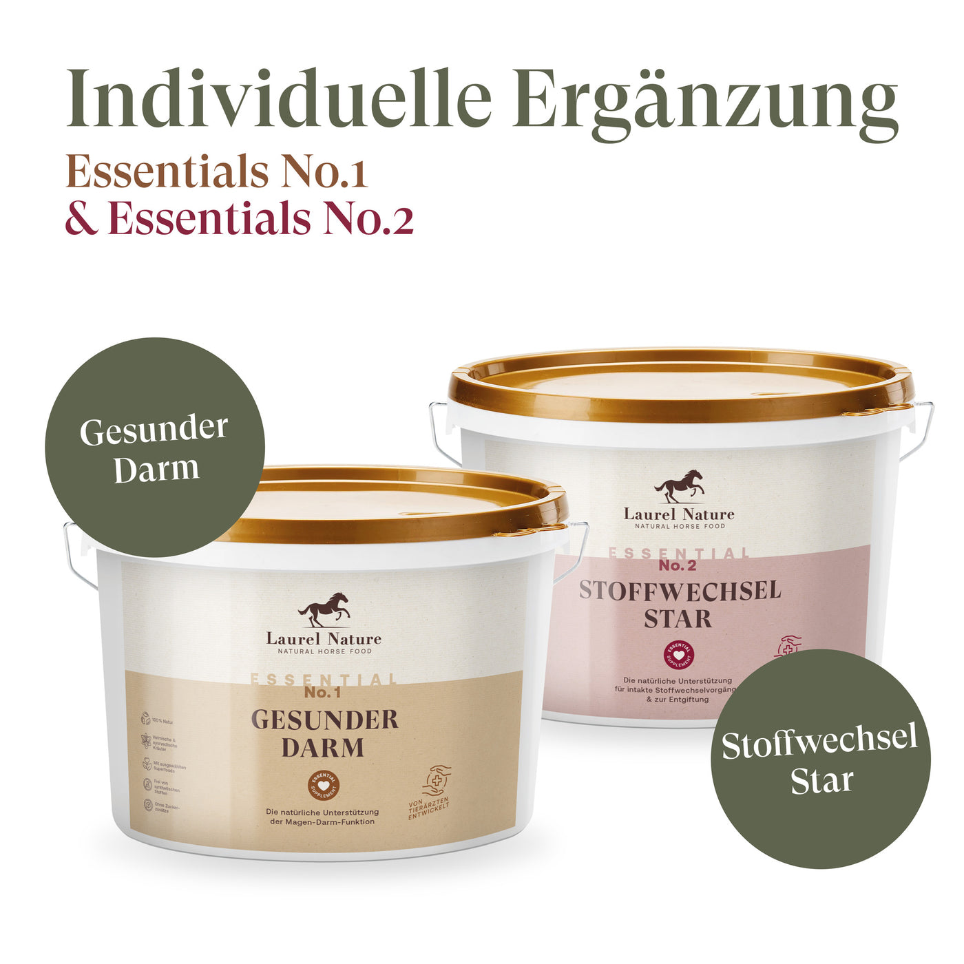 Die "Laurel Nature Essentials" ergänzen das Konzept durch spezifische Lösungen für jede Herausforderung (weitere Essentials folgen!) – ohne dass du dich in die komplizierte Welt der Einzelkräuter und deren Kombination vertiefen musst. So wird dein Pferd in allen Lebenslagen unterstützt.