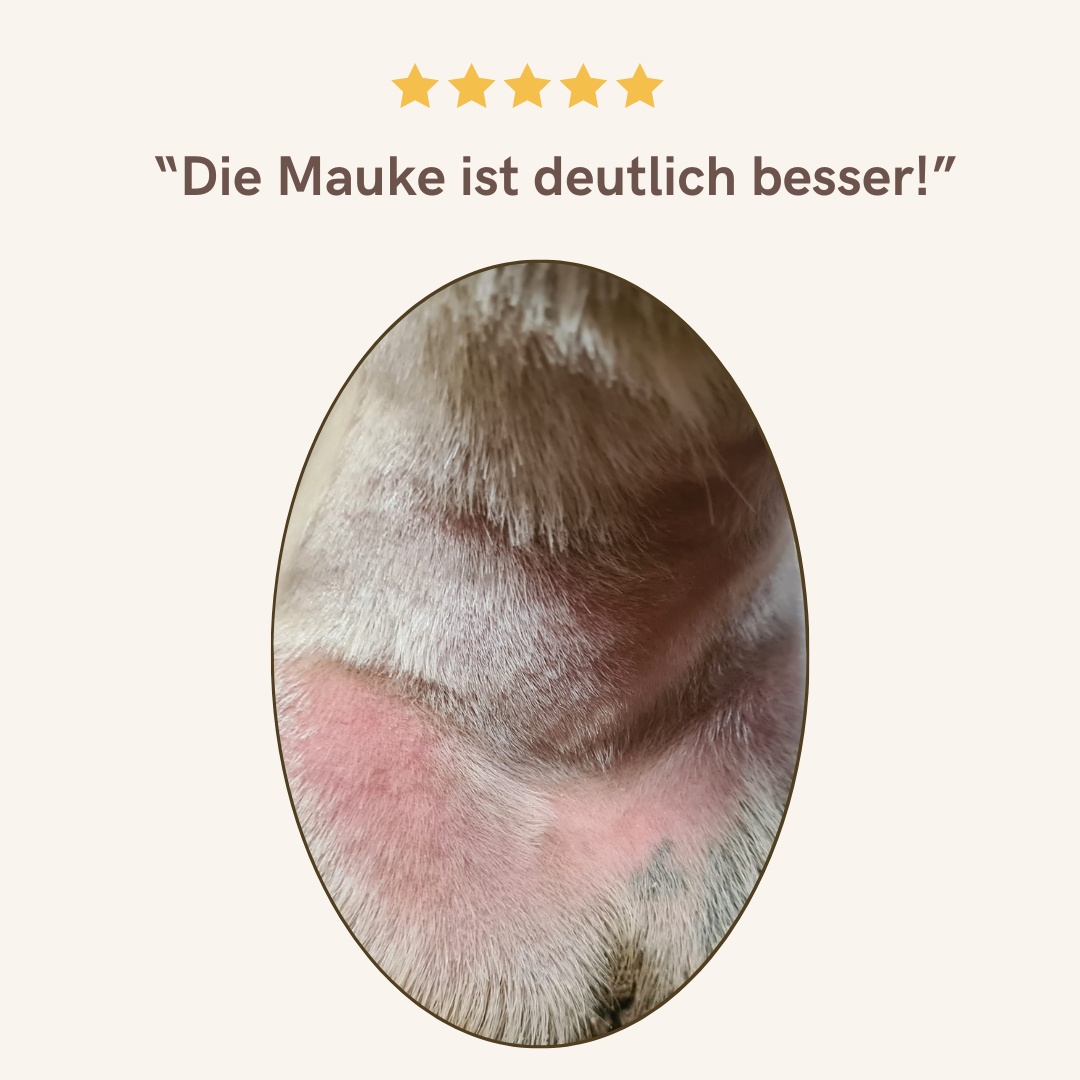 “Die Mauke ist deutlich besser, die schuppigen Stellen sind nur mehr bissl "rauh", die Krusten sind grißteils weg, die Haut an sich ist rosig, geschmeidig, nicht trocken und nicht entzunden. "