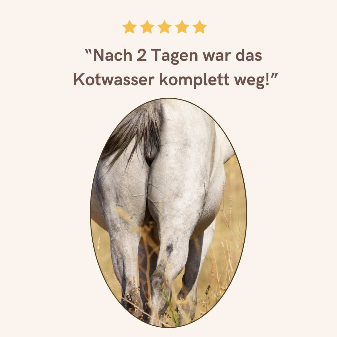"Nachdem ich schon diverse Strategien und gefühlt sämtliche Mittel zur Behebung von Kotwasser durchprobiert habe, habe ich hier endlich die Lösung gefunden: nach zwei Tagen war das Kotwasser komplett weg. Ich bin sprachlos... Mittlerweile bin ich beim zweiten Eimer und der Pferdepo ist nach wie vor trocken! Vielen Dank!"