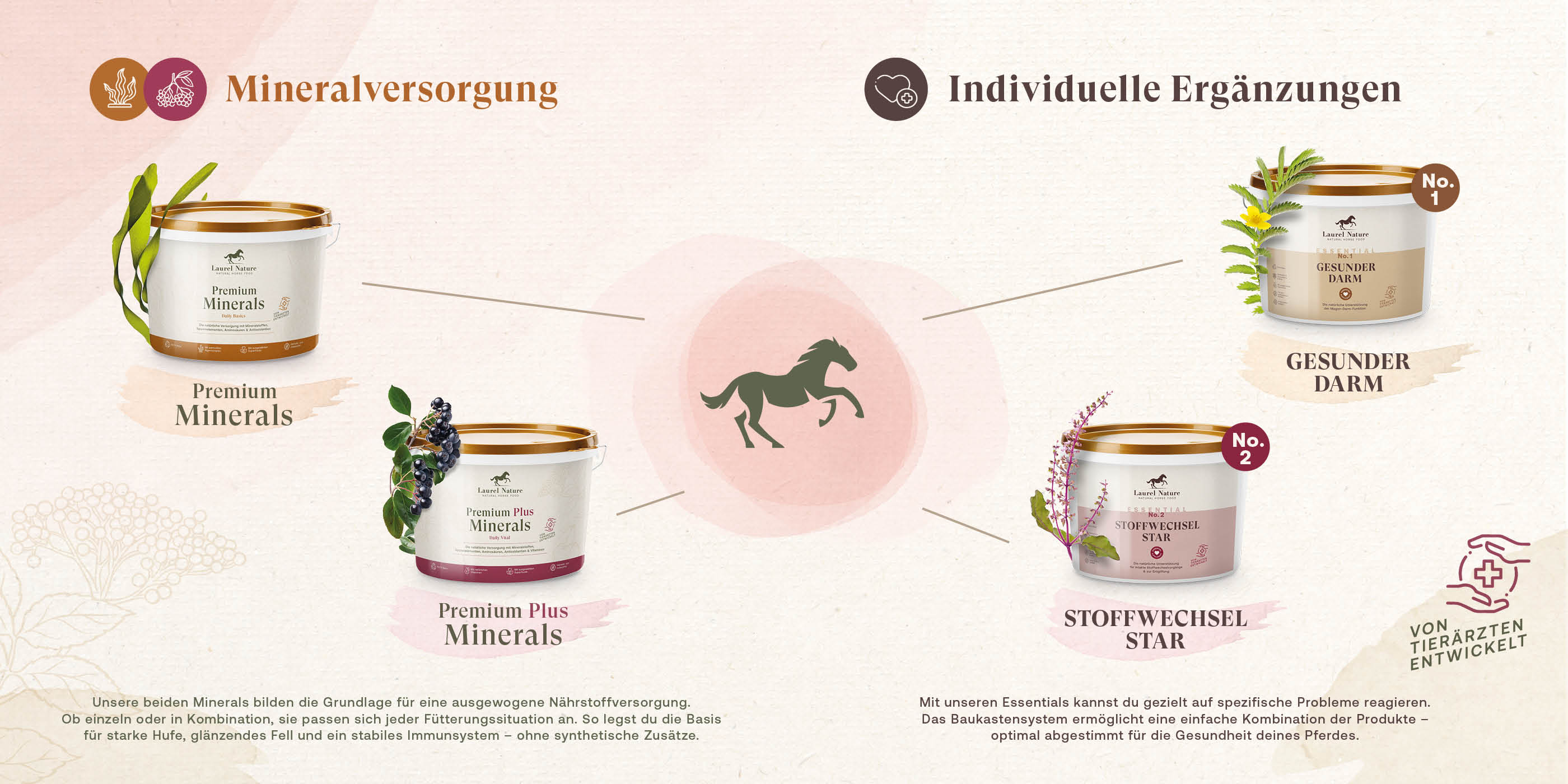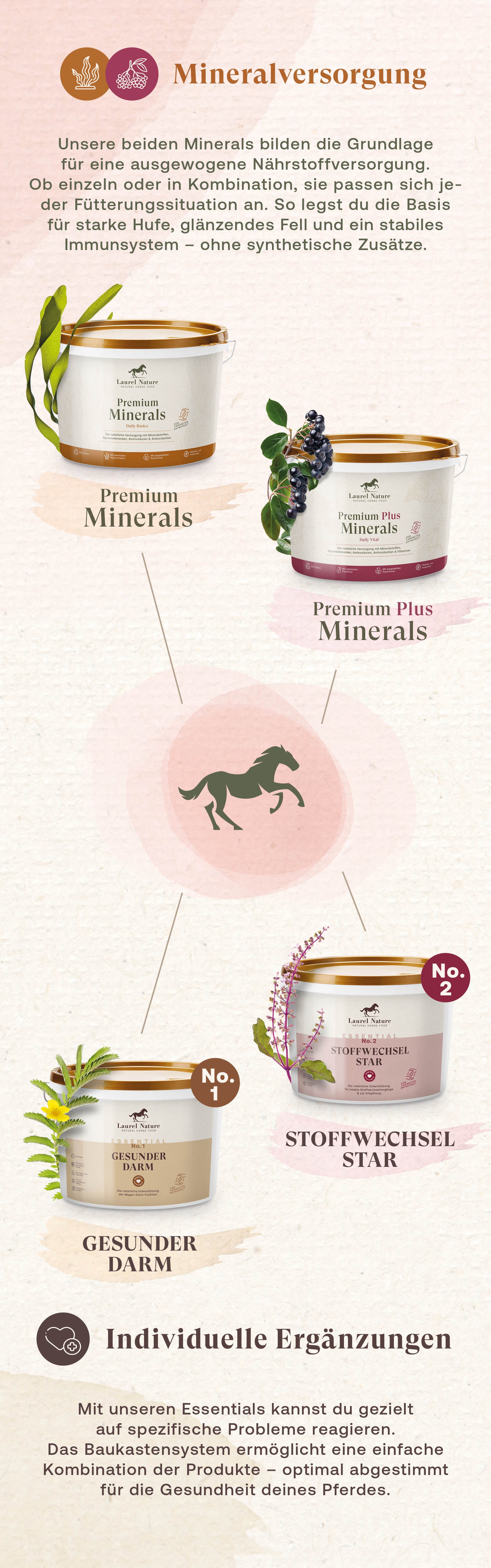 Das Laurel-Konzept für die natürliche Pferdegesundheit funktioniert wie ein Baukastensystem, das schrittweise verschiedene Organsysteme unterstützt