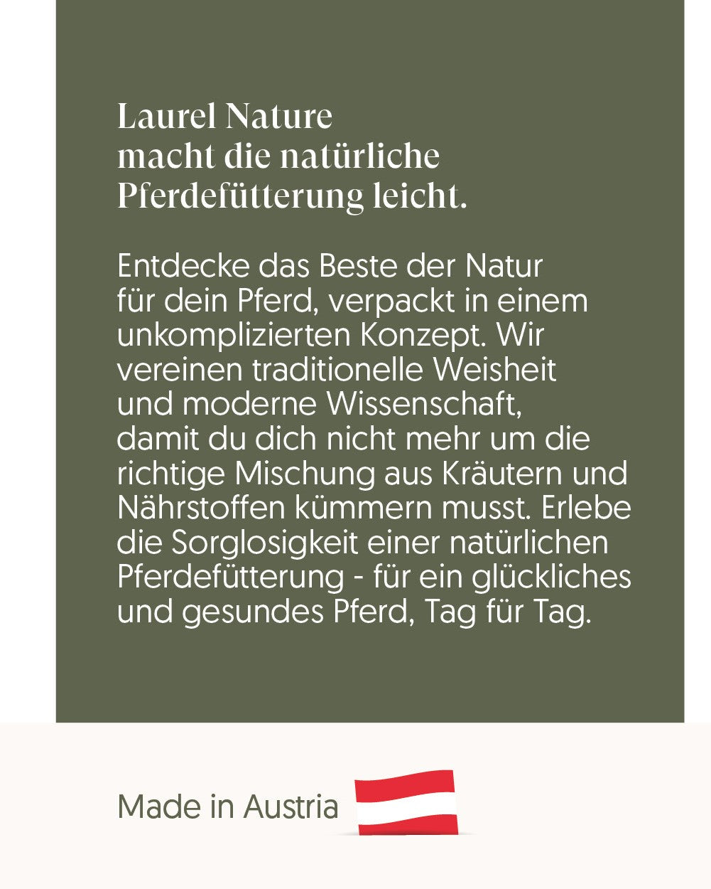 Dies ist die Reinheitsphilosophie von Laurel Nature. Wir stehen für eine kompromisslose Nahrungsergänzung für Pferde. Ohne Schnickschnak, kein Getreide, keine Chemie