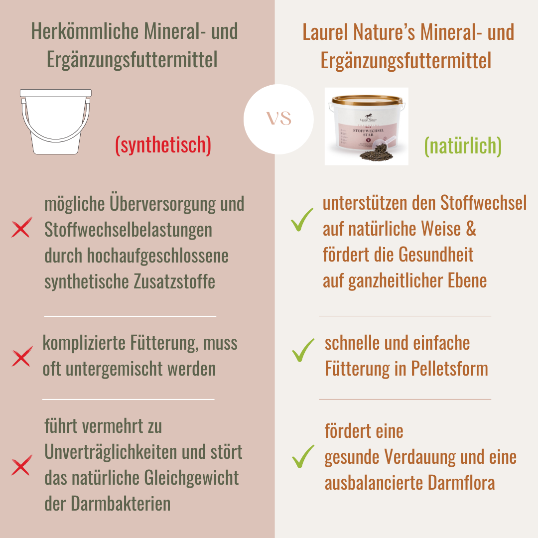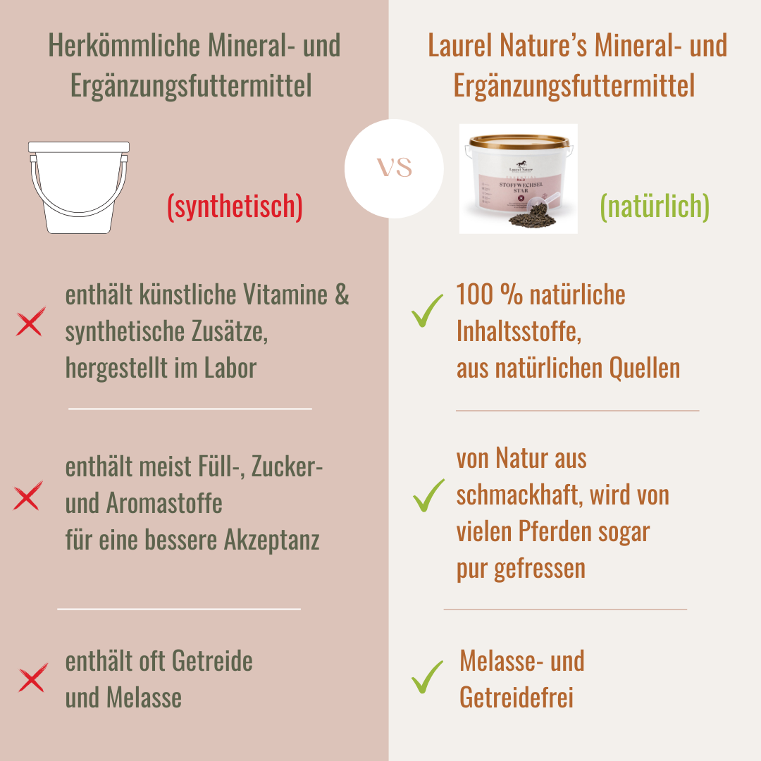 98 % der Futtermittelhersteller setzen auf synthetische Inhaltsstoffe. Natürliches Pferdefutter berücksichtigt die Komplexität des Organismus und fördert ganzheitliches Wohlbefinden.